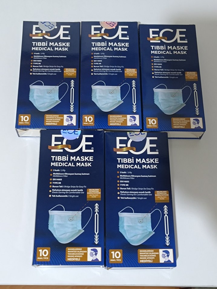 3 katlı tek kullanımlık tıbbi maske seti. Ürünler tamamen sıfır, orijinal ambalajlarında ve hiç açılmamış durumdadır. Paketlerin üzerindeki fabrika çıkışı parlak jelatin mühür duruyor, açılmamış - tam sıfır ürün. Toplam 5 paket olup, her pakette 10 adet maske bulunmaktadır. (Total: 50 adet) Paket içinde maskeyi arkadan bağlamaya yarayan maske aparatı mevcut. Yumuşak lastik yapısı ve burun teli sayesinde yüze uyum sağlar. Günlük kullanım, iş yeri, okul, atölye, depo ve genel hijyen amaçlı kullanım için uygundur.