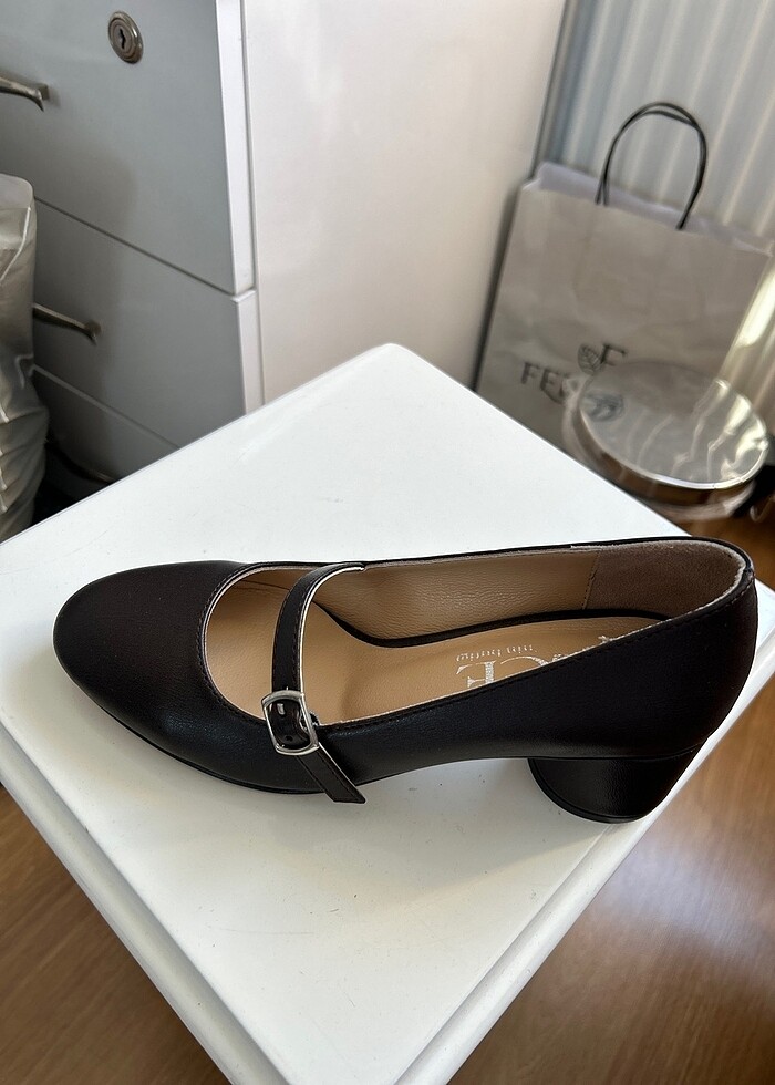 Hiç giyilmedi. Rengi acı kahve . İçi Deridir.Dış malzeme suni deridir. Topuk Boyu 5 cm