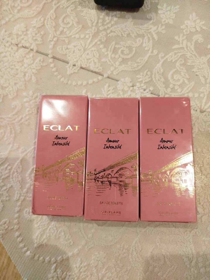 Eclat Amour Intense kadın parfümü, pembe kutuda altın detaylarla şık ve zarif bir koku sunar. Oriflame markası, eau de toilette. tekli fiyatı 500₺