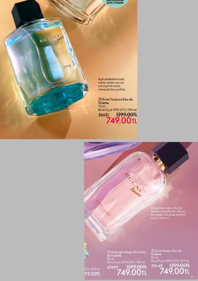 Eclat Toujours ve Eclat Amour kadın parfümleri, 75 ml şişede romantik ve ferah kokular sunar. Her biri 749,00 TL fiyatındadır.