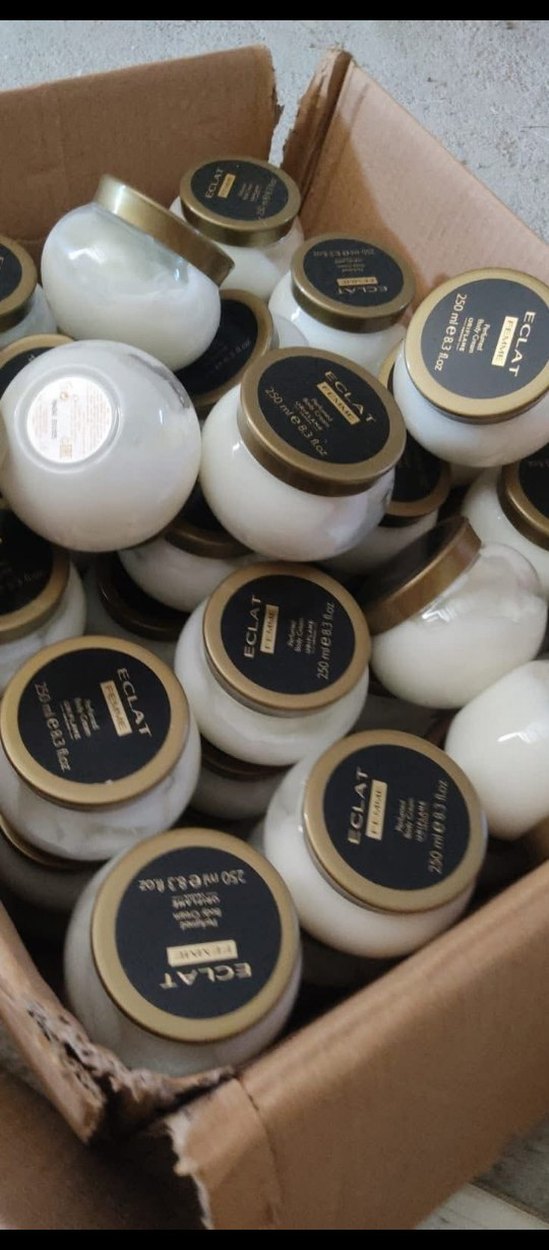 Eclat vücut kremi, 250 ml kavanozlarda, cildi yumuşatan ve nemlendiren zengin kıvamlı krem. Altın kapaklı, siyah etiketli şık kavanozlar.