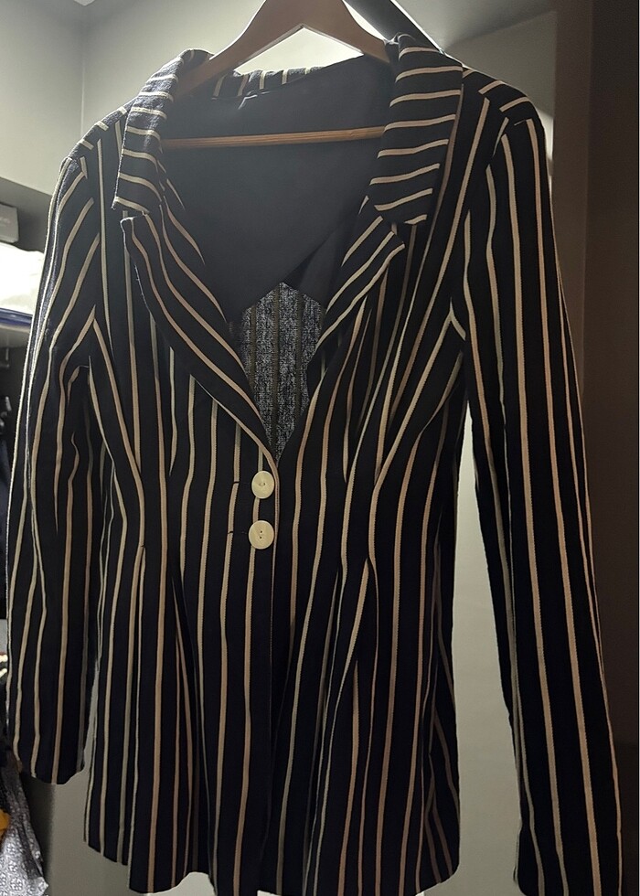 Ürün daha önce bir dizide görülerek sipariş verilmiş ancak beden uymadığı için dolap beklemiştir. Tertemiz ve sorunsuzdur. Keten, lacivert zemine beyaz çizgilidir. 36-38 bedene uygundur