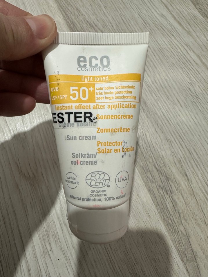 Eco Cosmetics açık tonlu güneş kremi, SPF 50+ koruma sağlar ve uygulama sonrası anında etki gösterir. Suya dayanıklı ve organik sertifikalıdır. ☀️birkaç kez kullandım neredeyse tamamı duruyor.