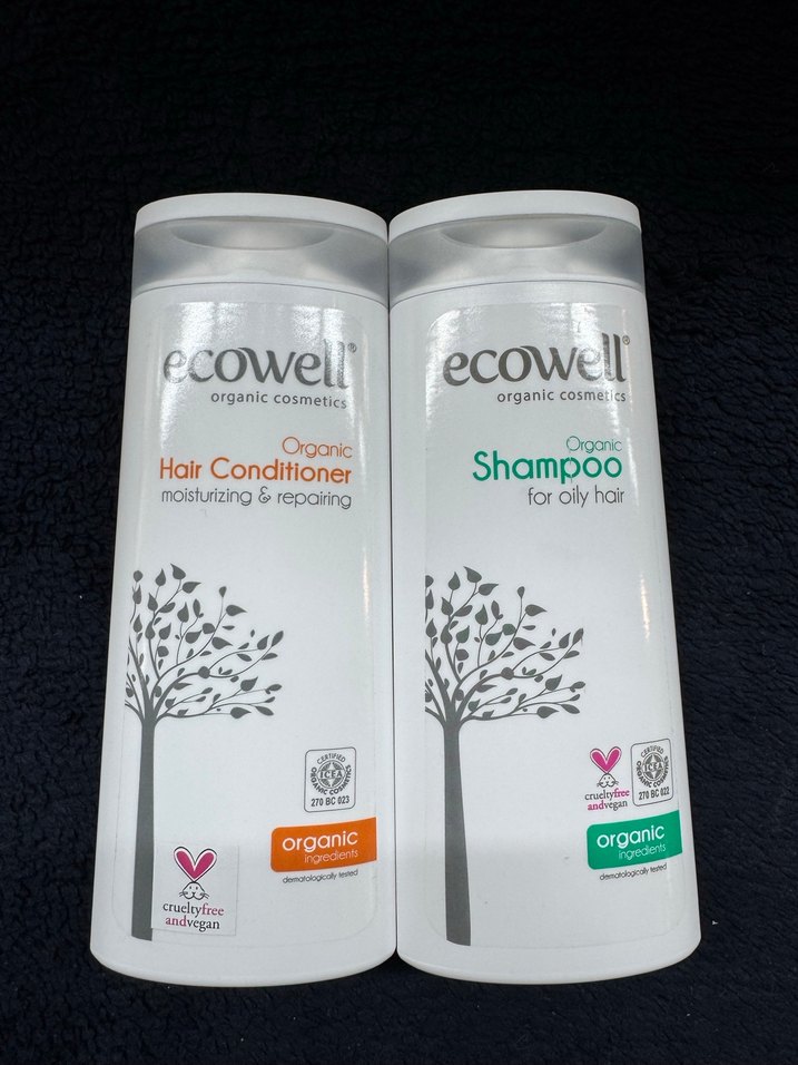 Ecowell organik şampuan ve saç kremi seti, yağlı saçlar için özel. Saç kremi nemlendirir ve onarır, ürünler organik içeriklidir ve hayvanlar üzerinde test edilmemiştir.