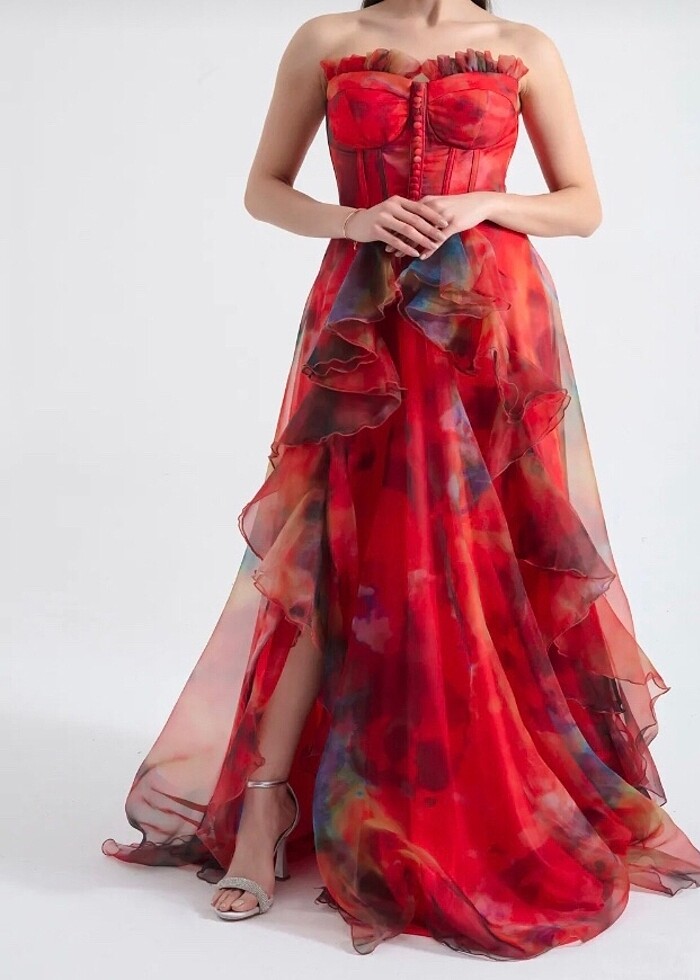 Ecrin collection 38/42 -turuncu kırmızı-straplez-organze-uzun-ab
