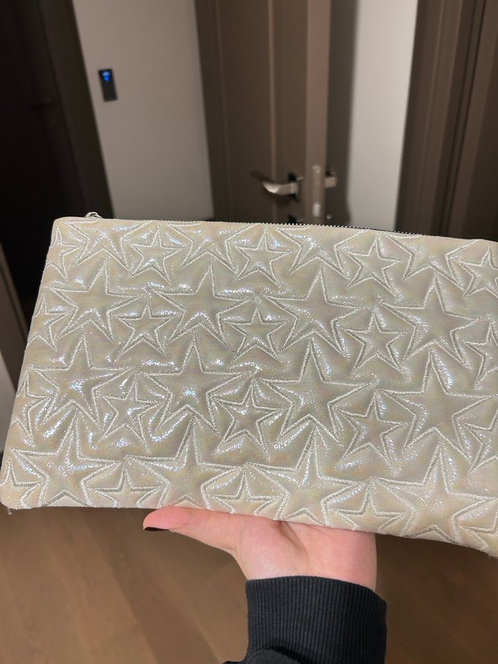 Parlak bej deri üzerine nakışlı yıldız desenleriyle kadın portföy çanta, çağdaş ve Paris etkisi taşıyor. Günlük kullanım için uygun.