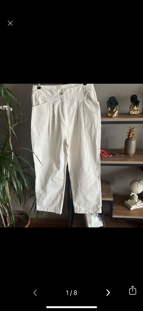 Ecru kadife kumaştan, pilili ve bol kesim midi uzunlukta, günlük kullanıma uygun rahat kadın pantolonu. Sayılı kullandım. 32 beden ama 40 beden için uyumlu. Çok temiz yeni bir ürün.Double paça.