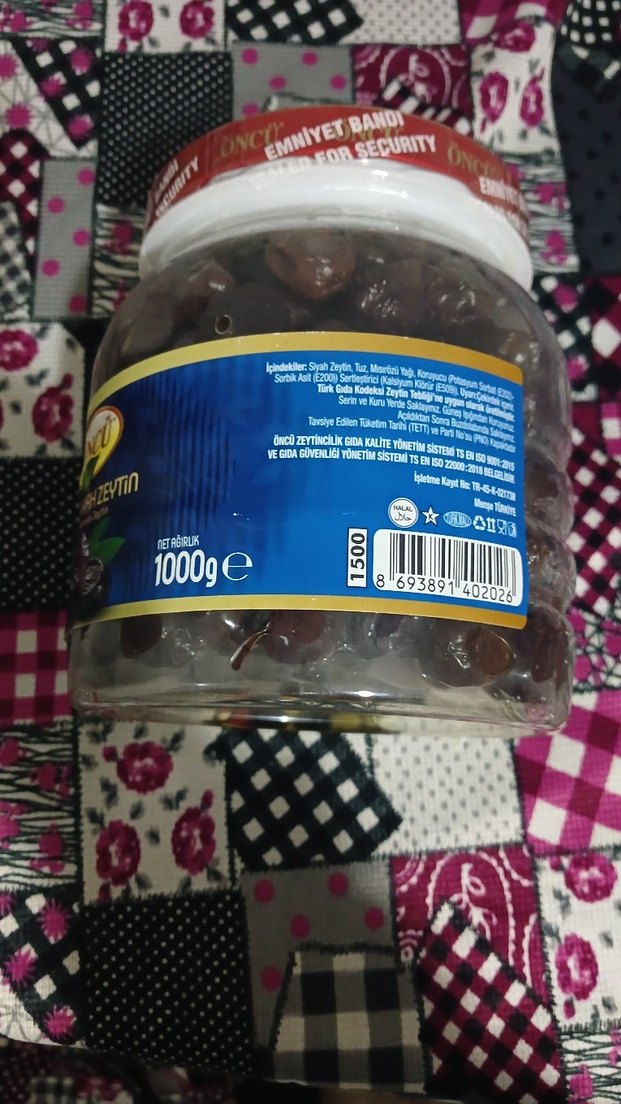 zeytin 1000g ambalajda, çeşitli kullanımlar için uygundur. Güvenlik için emniyet bandı ile kapatılmıştır.