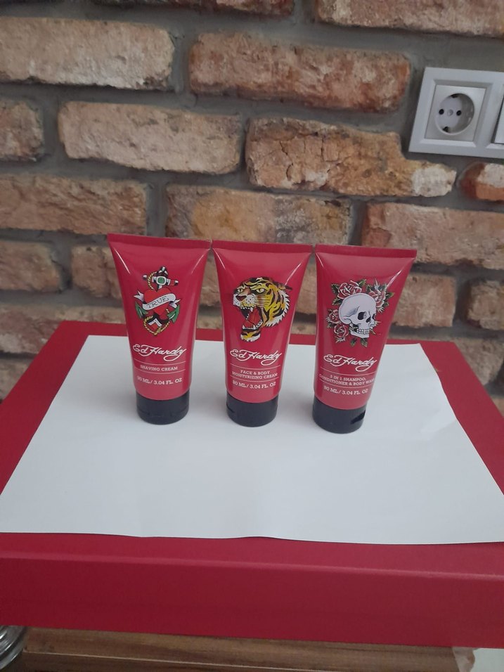 Ed Hardy krem seti, dövme temalı üç farklı tasarıma sahip tüplerle nemlendirici bakım sunar. ️