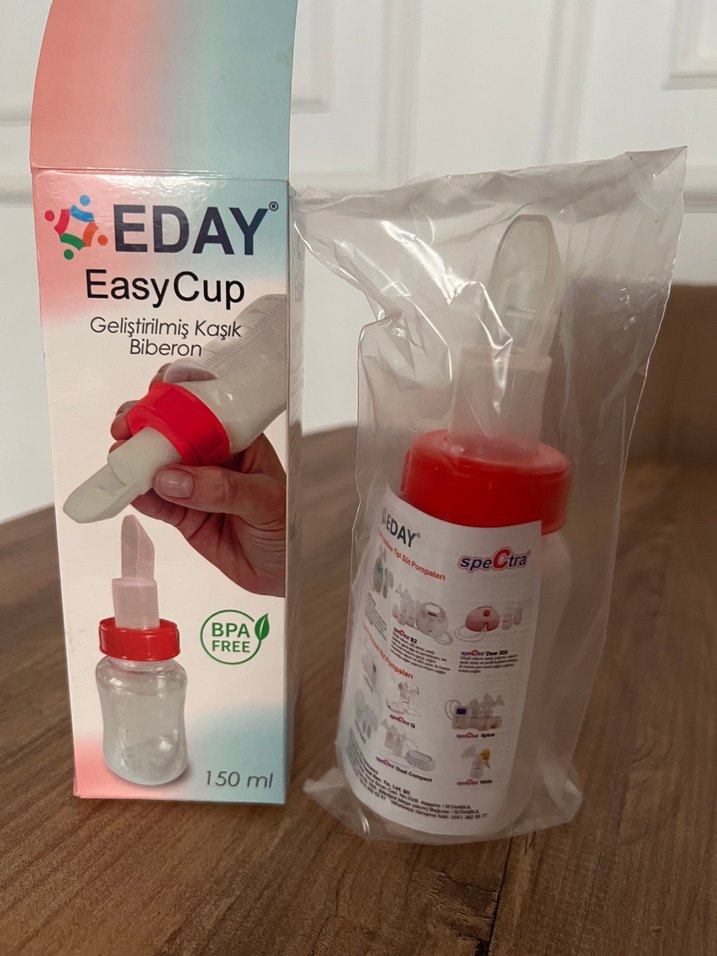 EDAY EasyCup 150ml hacminde, kırmızı kapaklı ve kaşık aparatı bulunan BPA içermeyen bebek biberonudur. Hiç kullanılmamıştır