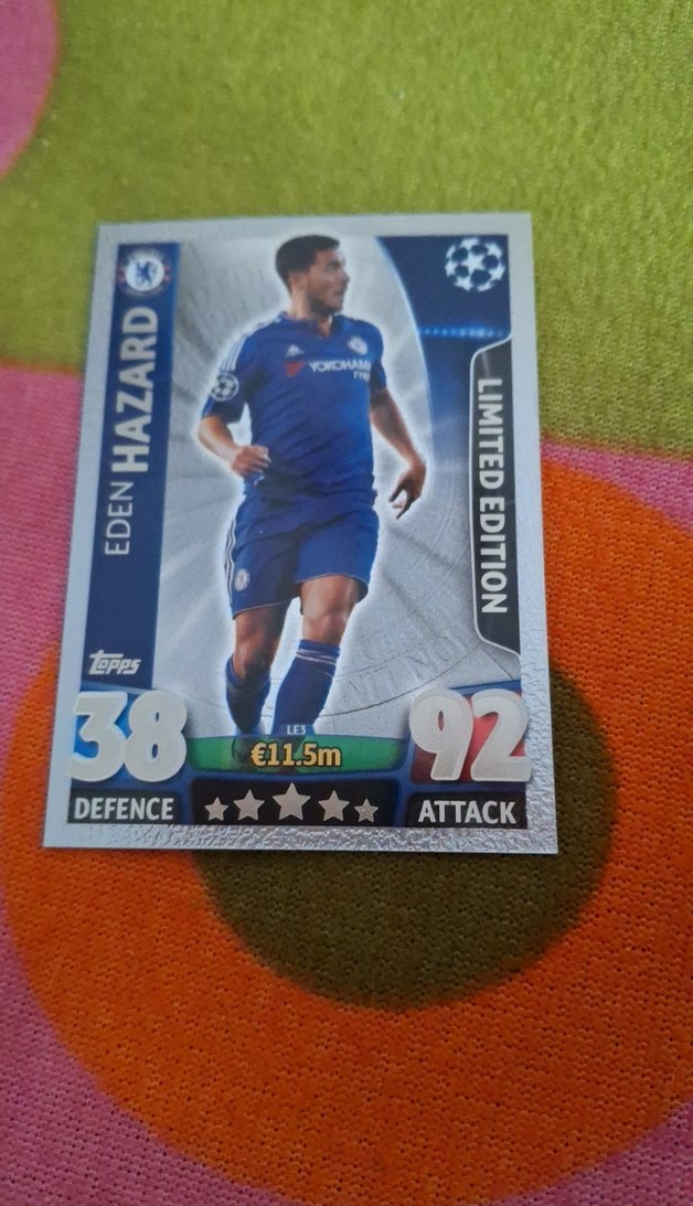 Parlak mavi renkte Eden Hazard sınırlı baskı rozet, 92 saldırı ve €11.5m değer bilgileriyle dikkat çekiyor. ⚽