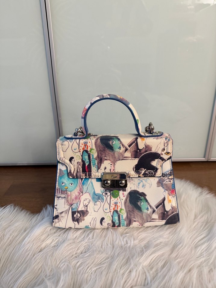 Pastel çok renkli baskılı, tokalı kapamalı, sentetik kumaştan yapılmış kadın çantası, günlük kullanıma uygun.
