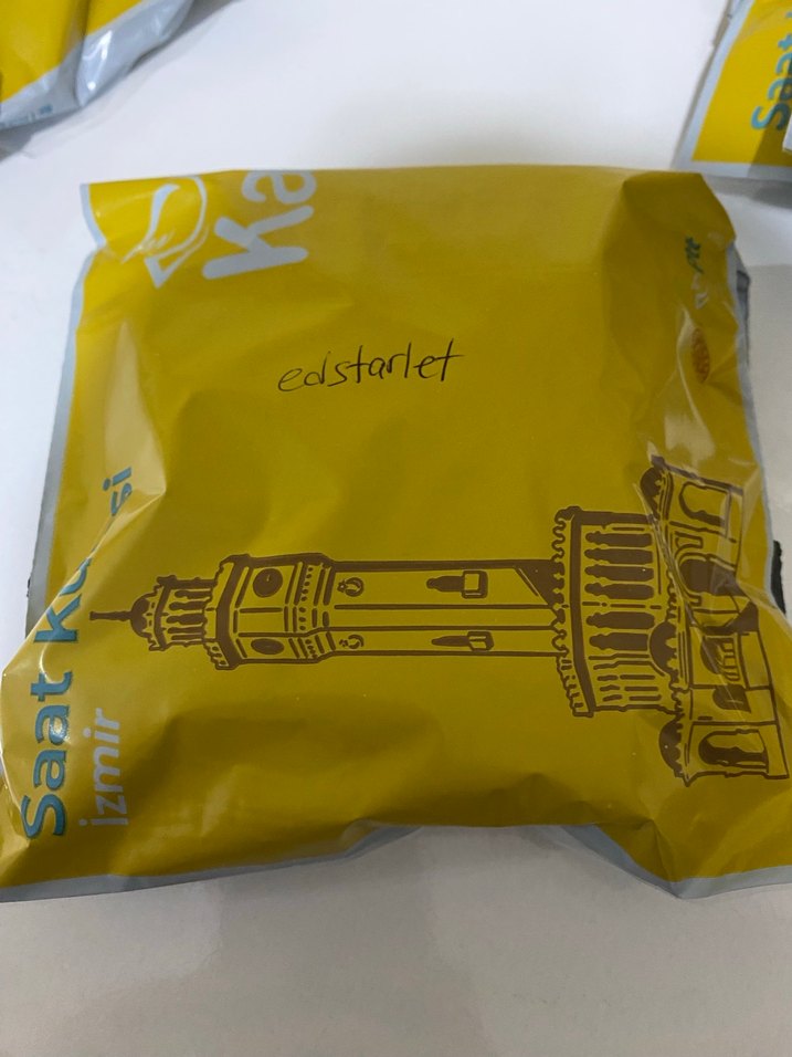 Açık sarı renkte, İzmir Saat Kulesi baskılı yastık kılıfı. Üzerinde 'edstarlet' yazısı bulunur. ️