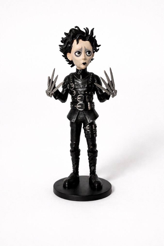 Siyah aksiyon figürü, detaylı koyu saçları ve makas elleriyle Edward Scissorhands karakterini yuvarlak bir taban üzerinde gösterir. ✂️ ürün 3D printer ile basılmış olup akrilik boya ile boyanarak vernik işlemi uygulanmıştır. Bir tane parmağı kırıktır görsellerde gözükmektedir.