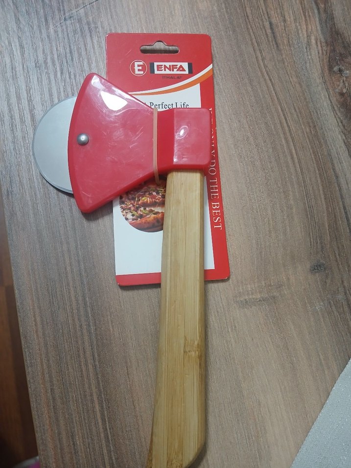 EENFA pizza kesici, renkli kırmızı plastik sap ve ahşap tutma kısmına sahiptir. Keskin tekerleği ile kolay dilimleme sağlar. Mutfakta kullanıma uygundur.