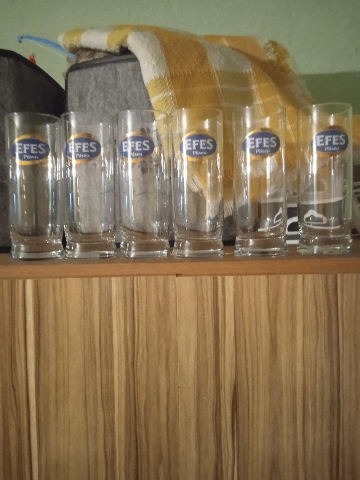 Efes Pilsen logosu bulunan, şeffaf camdan yapılmış 6'lı bira bardağı seti.