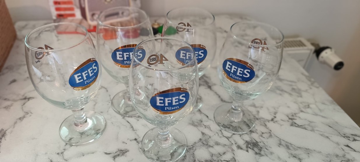 Efes Pilsen logosu bulunan cam bardak seti, parlak yüzeye ve sağlam ayağa sahiptir.