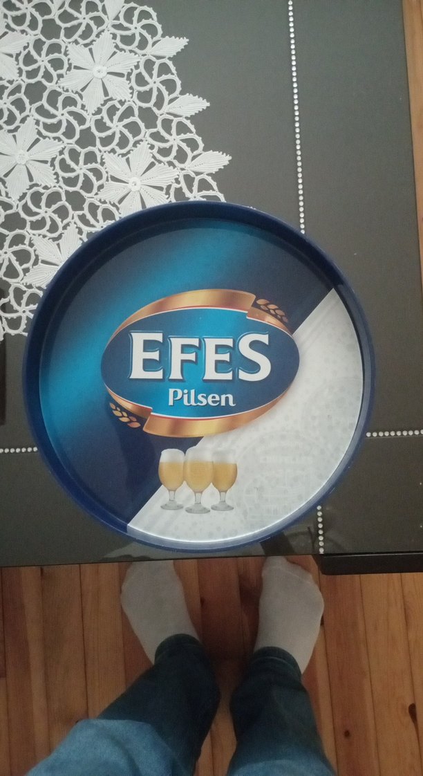 EFES Pilsen logosu ve bira bardakları resmi bulunan, parlak mavi metal tepsi. İçecek servisinde kullanılır.