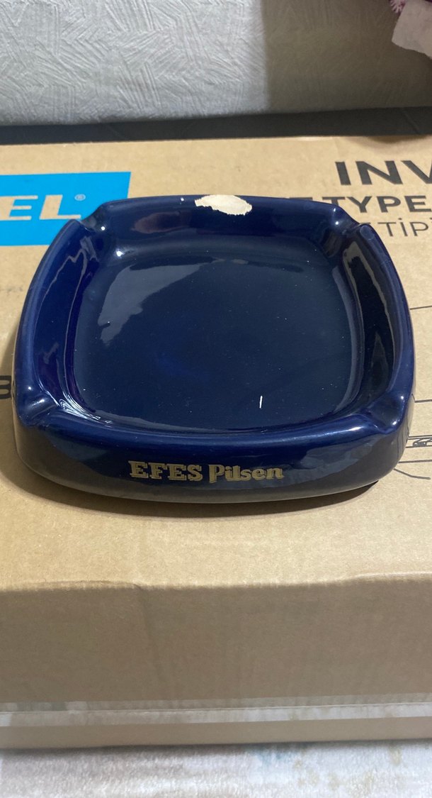 Koyu mavi seramik kül tablası, üzerinde Efes Pilsen baskısı bulunur. Kare şekilli, parlak yüzeylidir. Koleksiyon veya marka tutkunları için uygun.