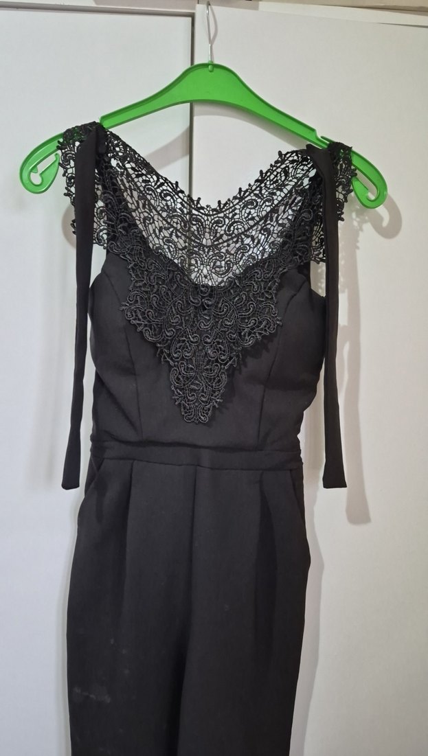 Bu siyah tulum, V yakada dantel nakış ve askılı kollara sahip, uzun boylu ve dar kesimdir.