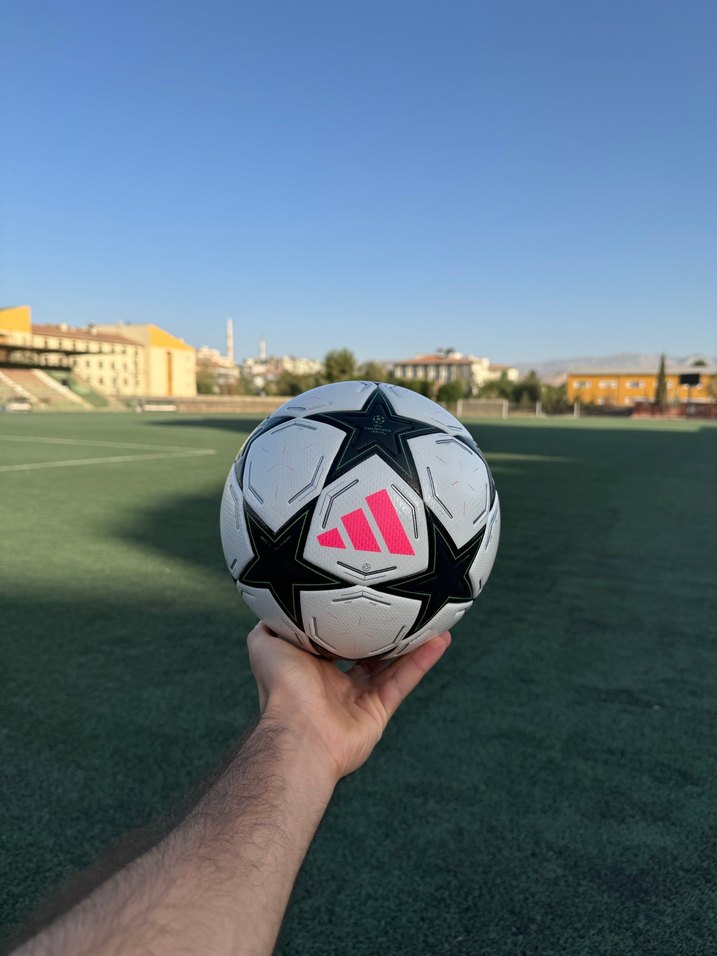Adidas futbol topu, beyaz zemin üzerinde siyah yıldız desenleri ve pembe logo ile açık hava sahalarında kullanım için uygundur.