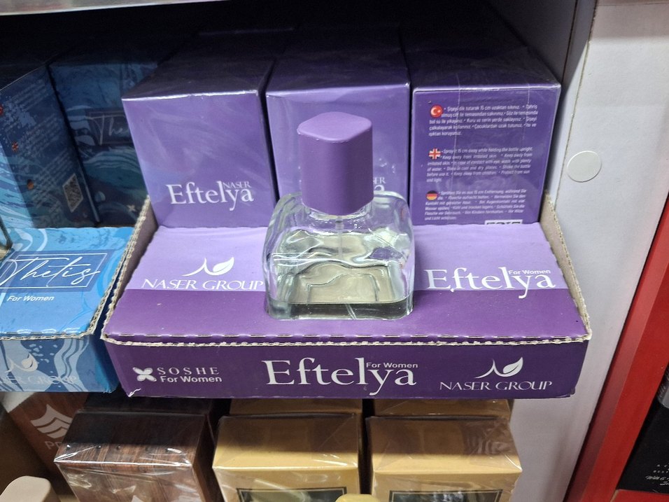 Eftelya kadın parfümü, 100 ml şişede, mor kapaklı, Naser Group tarafından sunulan ferah ve zarif bir kokuya sahiptir.