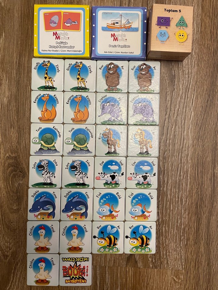 Çocuk Eğitici Kutu Oyunları.1.Hafıza oyunu.2.Yön,Konum,Boyut Öğreten Oyun Kartları.3.Deniz Araçları Yapboz.4.Matematik Oyunu.5.Alfabe Yapboz Kartları.Sadece Hafıza Oyunu bir kaç kere kullanıldı,geriye kalanlar hiç kullanılmadı,sıfır ürünler.Herhangi bir kusurları,yıpranma,yırtık,leke yoktur.Toplam fiyat.