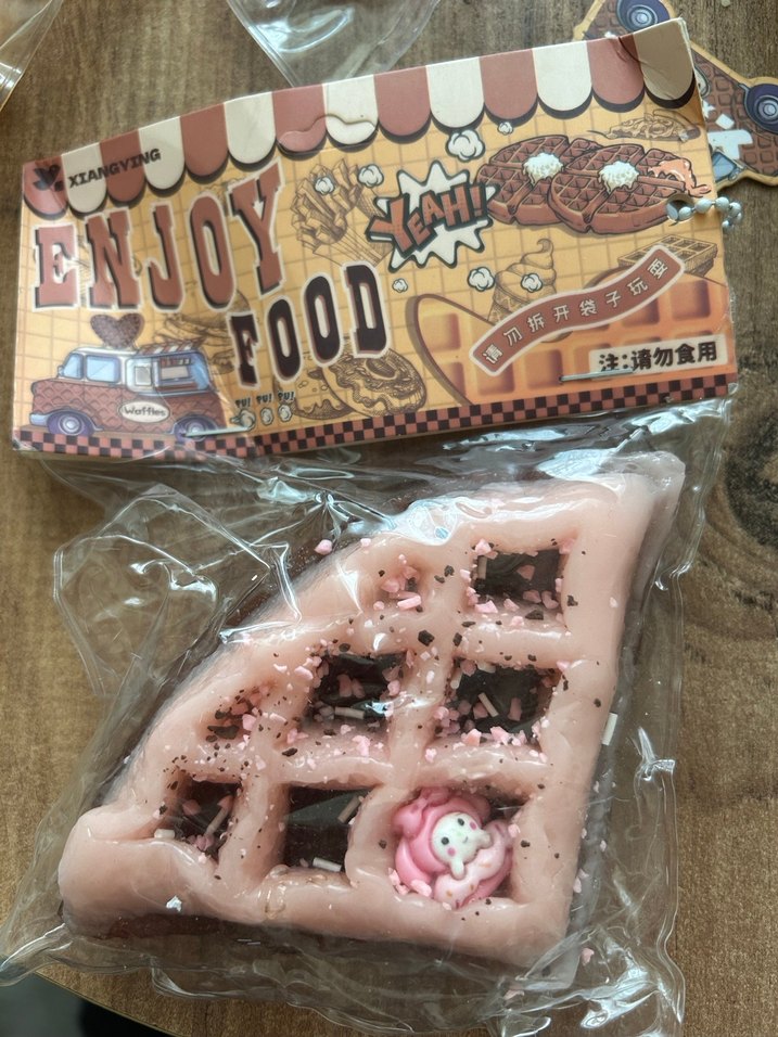 Pembe waffle şekilli, süslemeli ve küçük figürlü oyuncak, Enjoy Food markası altında paketlenmiş.