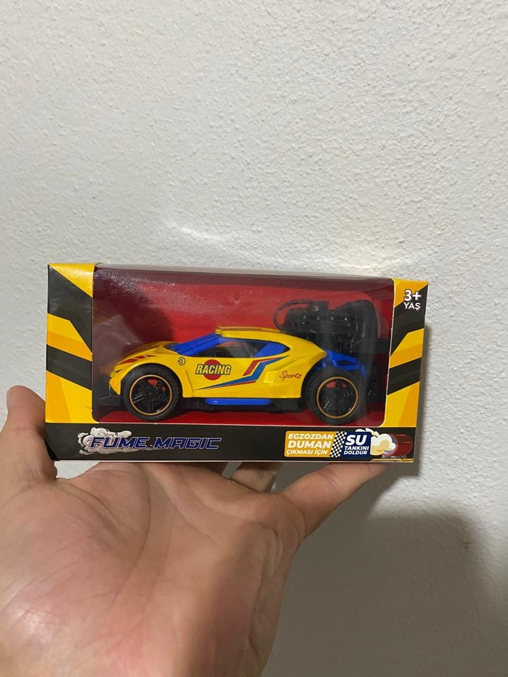 Renkli sarı oyuncak yarış arabası, duman ve su efektleri içerir. 3 yaş ve üzeri için uygundur. egzozundan djmamn çıkarıyor. çek bırak araba metal araba. yenidir. stok 2 adet