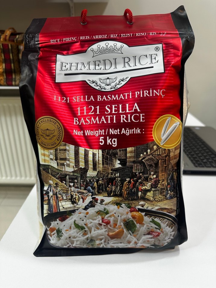 Ehmedi 1121 Sella Basmati Pirinç, 5 kg paket içinde, uzun taneli ve aromatik kaliteli basmati pirinçtir.