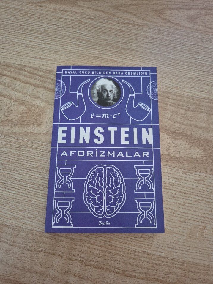 Einstein Aforizmalar adlı biyografi kitabı, Einstein'ın ünlü e=mc² denklemi ve aforizmalarını içerir. Kapakta Einstein'ın fotoğrafı ve zaman ile beyin simgeleri bulunur.