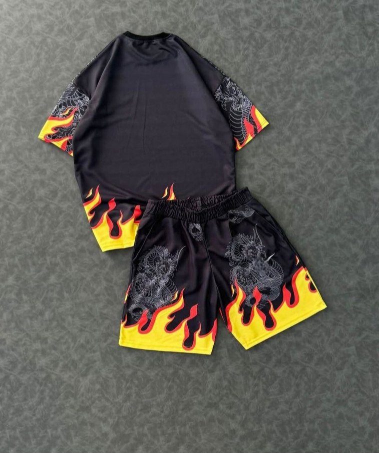 Erkekler için gevşek kesim, siyah zemin üzerine alev ve ejderha desenleriyle kısa şort takımı. Spor ve sokak giyimi tarzında, zahmetsiz şıklık sunar. Rahat kumaş, dikkat çekici tasarım. Günlük kullanım için ideal.