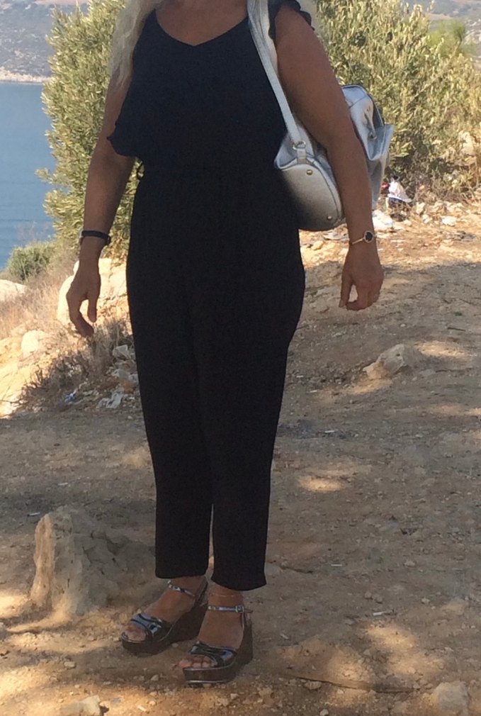 Bir kez giyilmiştirİ.. Tertemizdir..Bir kolu ince askılı, diğeri kalın askılıdır..Üst kısmı geniştir.. 36/42 beden arası uyumludur..Çok rahattır, terletmez.. Hertürlü ayakkabıyla şık durur.. Boyu 1.30 cm, İki koltuk arası 45 cm dir..siyah kadın tulum, rahat kesimiyle dış mekan kullanımı için uygundur.
