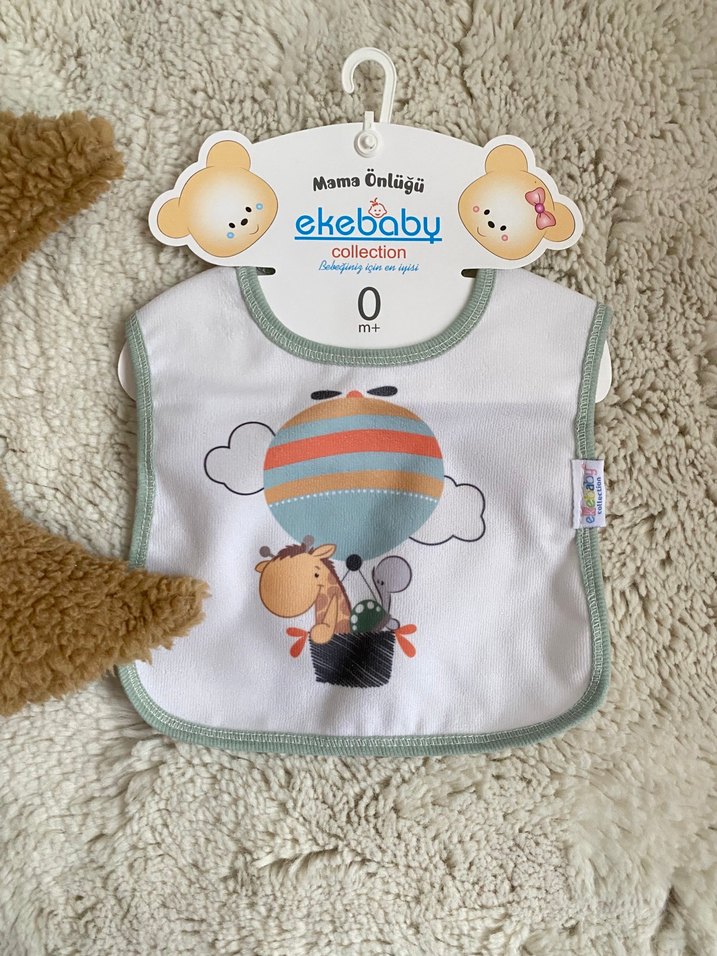 Ekebaby koleksiyonundan, hayvan ve sıcak hava balonu baskılı, 0 aylık bebekler için yumuşak ve rahat mama önlüğü.