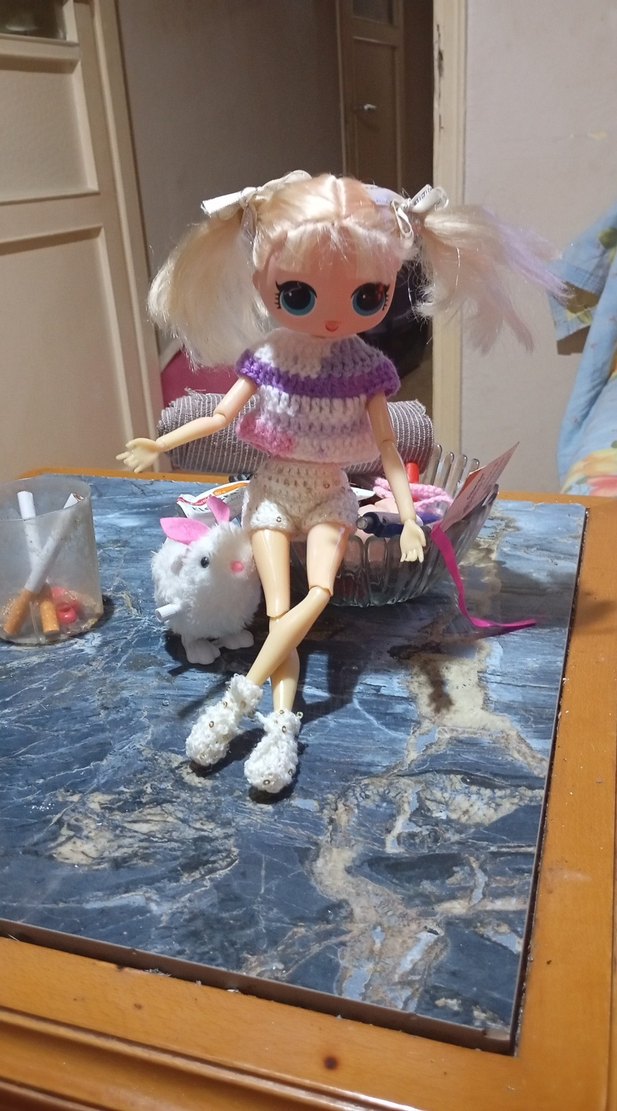 Beyaz saçlı, pastel renklerde örgü kıyafet giymiş lol bebek, kıyafetleri tasarımımdır. saçları kendiliğinden azdır dökülmüş değildir. her yeri eklem lidir. 32,cm.vintage bebektir.