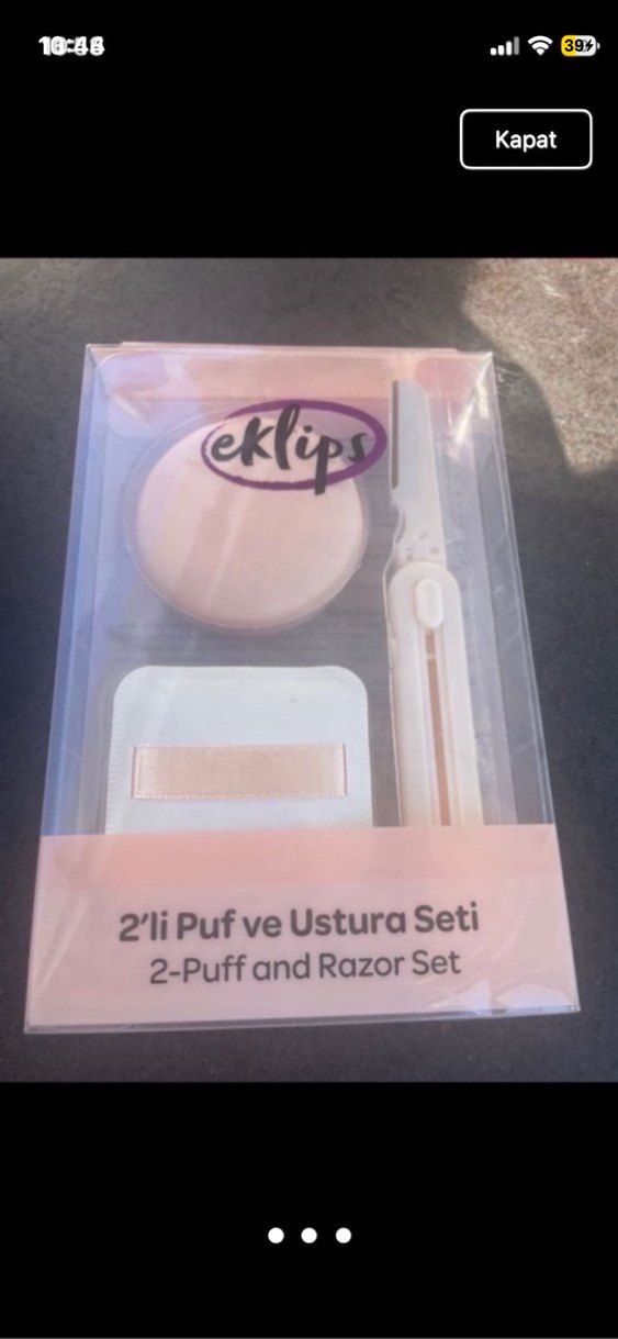 İki adet pembe pastel makyaj pufu ve bir usturadan oluşan set, hassas uygulama ve bakım için uygundur. Sıfır