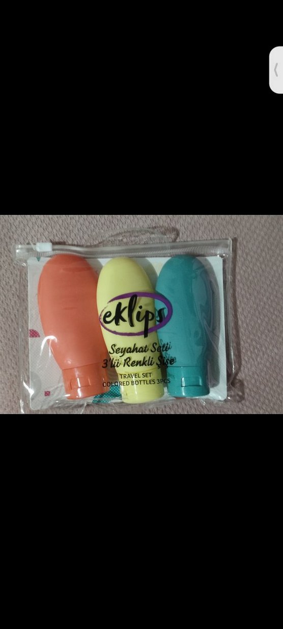 Eklips seyahat seti, turuncu, sarı ve turkuaz renklerde 3 adet pastel tonlu şişeden oluşur. Her şişe kapaklı ve şeffaf fermuarlı poşet içindedir.