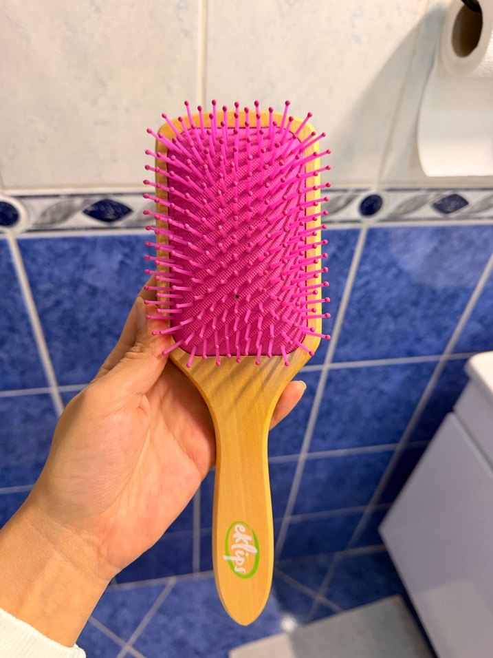 Eklips saç fırçası, ahşap sap ve yuvarlak uçlu parlak pembe kıllara sahiptir. Saçları nazikçe açar. ♀️