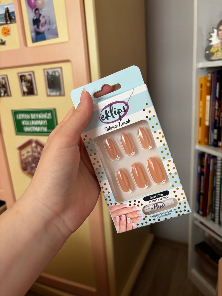 Eklips markasına ait pastel bej oval takma tırnak seti. Doğal görünümlü, kolay uygulanabilir ve yeniden kullanılabilir. kullanmadım