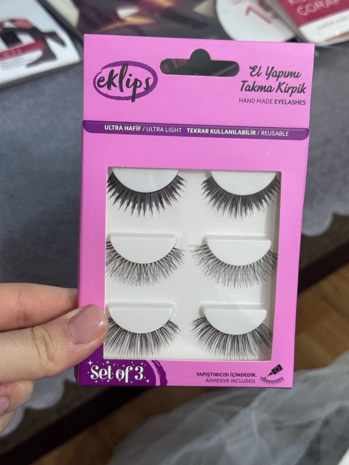 Eklips markasının el yapımı, ultra hafif ve tekrar kullanılabilir bej tonlarında 3'lü takma kirpik setidir. Yapıştırıcı kutu içindedir.