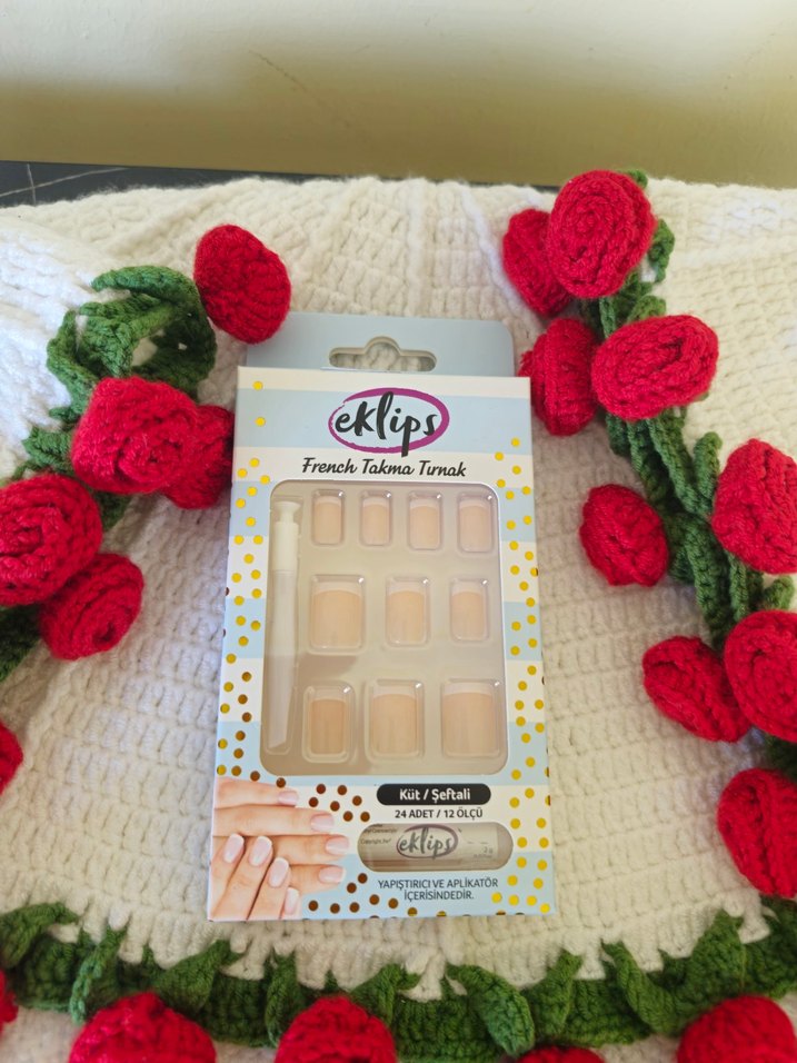 Eklips markasına ait bej renkte 24 adet, 12 farklı ölçüde French takma tırnak seti. Yapıştırıcı ve aplikatör dahildir.