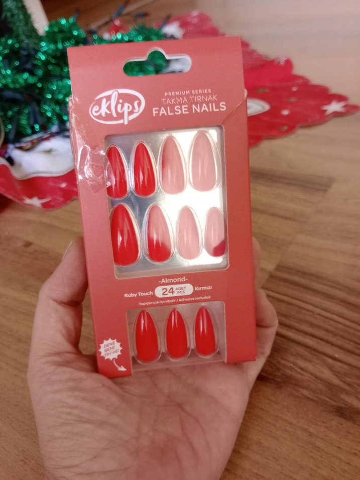 Eklips markasına ait kırmızı parlak almond şekilli 24 adet takma tırnak paketi. Kolay kullanım sağlar. #takmatırnak#xmas#nail#hediye#yeniyıl