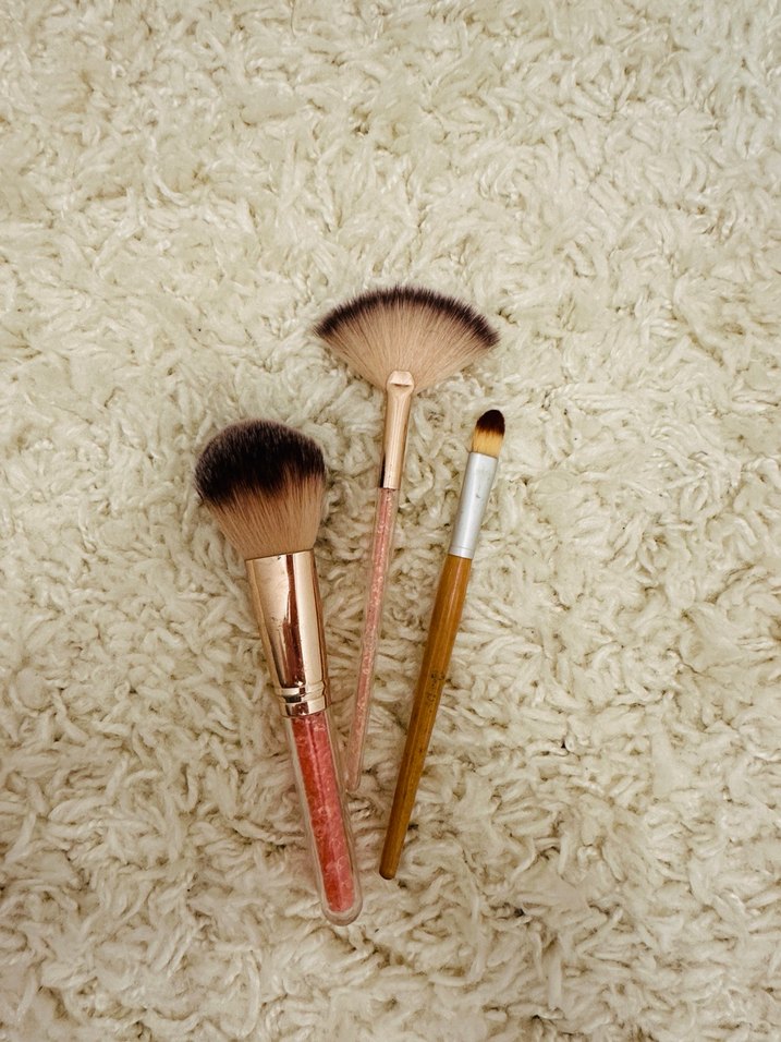 Bej saplı, yumuşak kıllı üçlü makyaj fırça seti; yelpaze ve farklı makyaj uygulamalarına uygun fırçalar içerir. ️