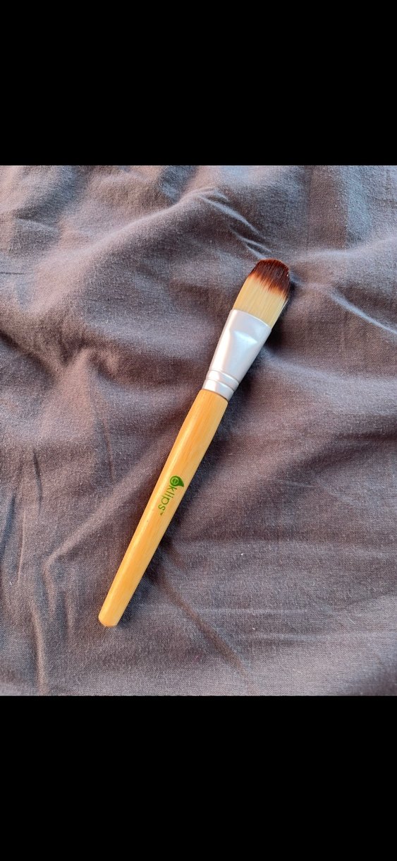 Yumuşak kıllara ve kolay kullanım sağlayan düz ahşap saplı bej makyaj fırçası.