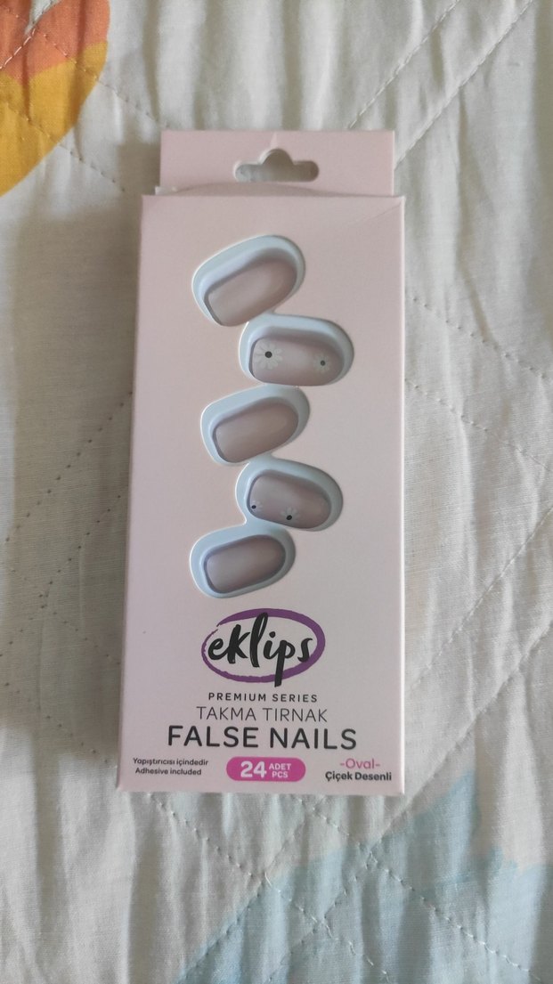 Eklips markanın pastel pembe tonunda oval şekilli, çiçek desenli 24 adet takma tırnak seti. Yapıştırıcı da pakete dahildir. Yeni alındı, hiç kullanılmadı.