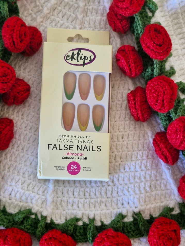 eKlips Premium Serisi pastel bej renkte, badem şekilli 24 adet takma tırnak ve yapıştırıcı içerir.