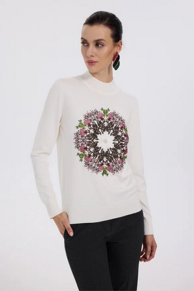 Beyaz örgü kumaştan, uzun kollu ve yuvarlak yaka bohem desenli, rahat kesim kazak. Günlük kullanıma uygun, retro tarzda.1 kez giyilmiştir.