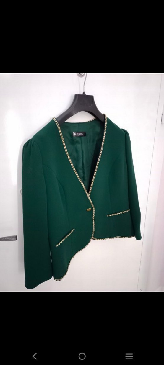 Düğmeli, yeşil mini blazer, fakir kollu ve klasik kesim. Parlak nakış detayları ve zincir süslemeleriyle ofis ve düğün için uygun. Özel günde 1 kere giyildi kusursuz, sorunsuz.