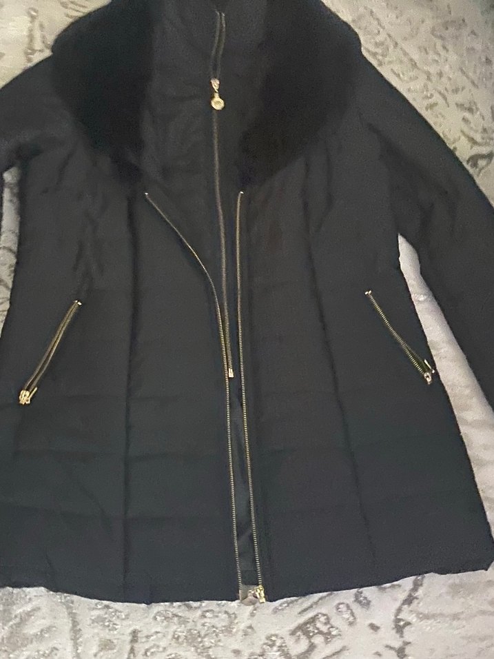 Fermuarlı, uzun kollu, siyah, kürklü yakalı ve midi boyda, rahat dokulu, genç ve şık kadın kışlık kaban kusursuz yelekli