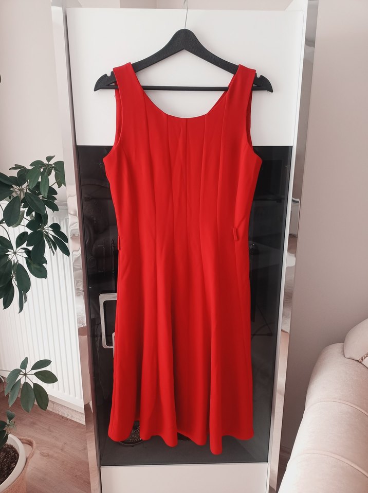 Koyu kırmızı renkte, kolsuz, V yakalı ve drapeli detaylı midi uzunlukta, vücuda oturan modern klasik elbise. Günlük kullanıma uygun. boyu 102 cm,beli 37 cm dir.sadece bir iki kez giydim sorunsuz.